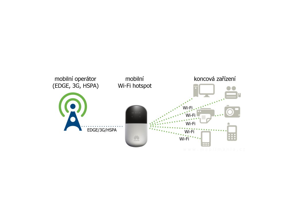 Revoluční zařízení zaručuje plně bezdrátové připojení k internetu pomocí jediného dotyku. HUAWEI Mobilní Wi-Fi zaručuje opravdu plně bezdrátové připojení k internetu, a to bez nutnosti jakéhokoli fyzického kontaktu s koncovým zařízením. Nechte si Mobilní Wi-Fi uložen jen tak v kapse a zůstaňte ve spojení s celým světem i na cestách. Nebo ji nechte ležet v obývacím pokoji a využijte možnosti přístupu k internetu ze svého počítače, mobilního telefonu, PDA (palmtopu) či MID (multimediálního) digitálního televizoru, ať už jste v domě na jakémkoliv místě.