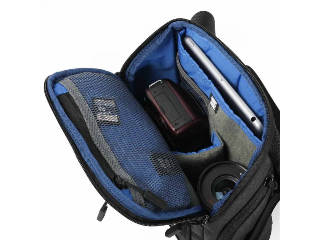 Dělená vnitřní část s přístupem shora i z boční strany umožňuje oddělit fotoaparát od zbylých věcí.
