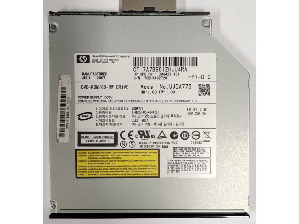 Nová nepoužitá značková mechanika HP UJDA775 24x CD-RW, 8x DVD Obecné vlastnosti: Černý rám – výška 9,5mm. Rozhraní IDE/ATAPI 2 MB vyrovnávací paměť Přístupová doba DVD-ROM: 155ms. Přístupová doba CD-ROM: 120ms. Rychlost zápisu: až 24 x CD-R Rychlost zápisu: až 24x CD-RW Rychlost čtení DVD-ROM: až 8x. Rychlost čtení CD-ROM: až 24x otvor pro nouzové vysunutí podporované disky: DVD-ROM DVD+R, DVD-R, DVD-RW DVD+RW.