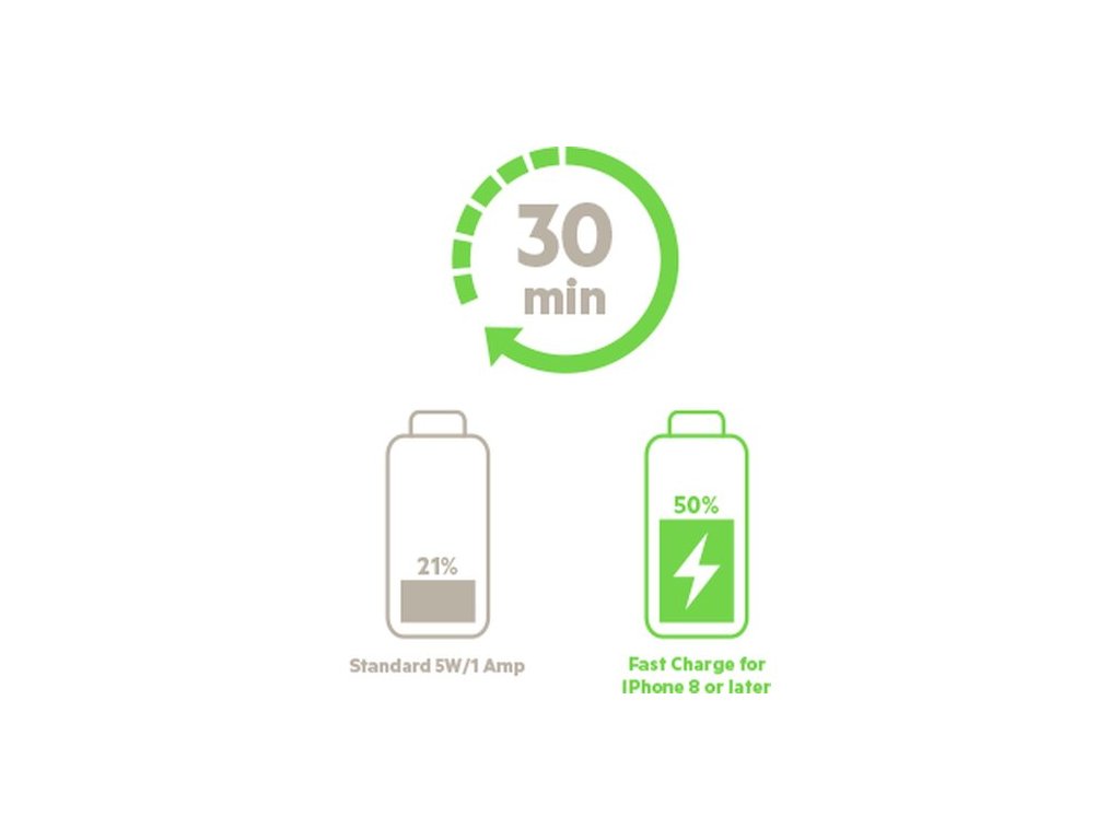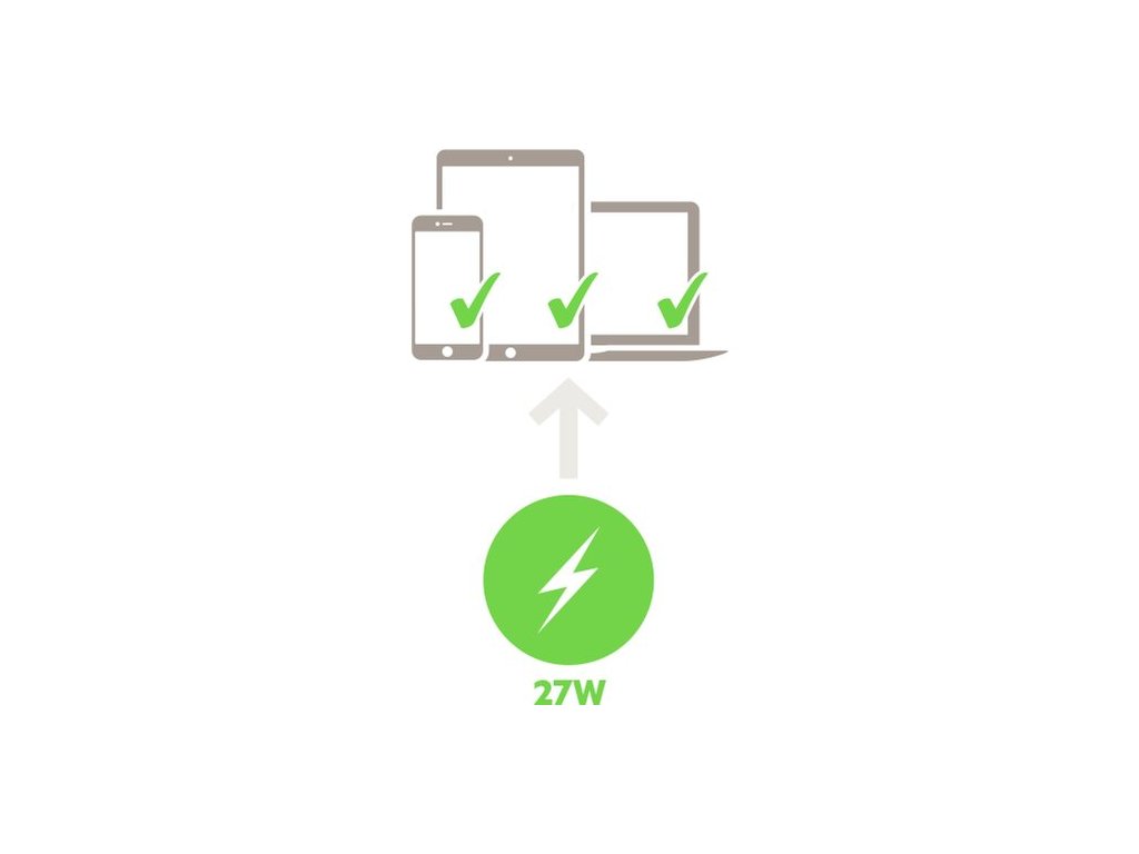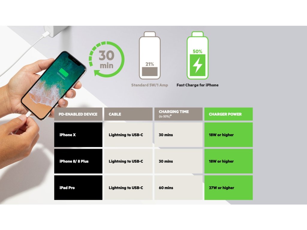 Domácí nabíječka USB-C bez kabelu s technologií power delivery, takže zařízení nabíjejí rychleji než kdy dříve. Nabíječka je uzpůsobena k nabíjení baterie zařízení iPhone X, iPhone 8 nebo iPhone 8 Plus až o 50 procent za 30 minut. Nabízí také nejvyšší možnou rychlost nabíjení (až 27 wattů) pro ostatní smartphony a tablety s podporou PD.