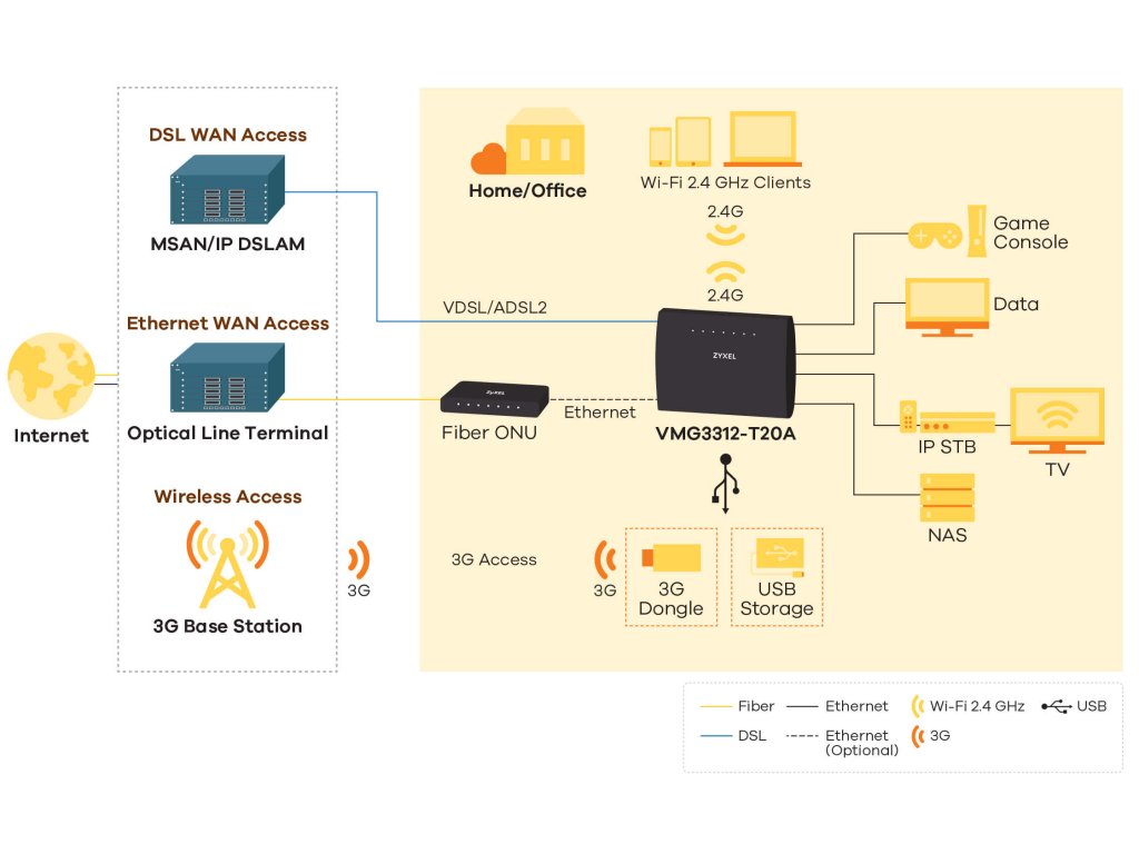 Zařízení ZyXEL VMG3312-T20A v sobě zahrnuje přístupový bod IEEE 802.11 b / g / n a ethernetový přepínač 10/100 pro přístup k místní síti (LAN). Může fungovat jako prostředník pro distribuci obsahu mezi různými zařízeními připojenými uvnitř sítě LAN a bezdrátovou sítí.
